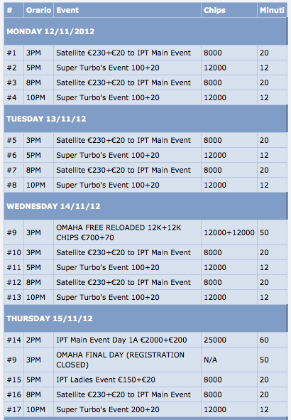 Το Main Event έχει buy in €2.000 + €200 με cap τους 500 παίκτες. Οι συμμετέχοντες θα ξεκινήσουν με 25.000 μάρκες σε ωριαία blind levels. ενώ συνολικά θα διεξαχθούν 23 events. Το πλήρες πρόγραμμα μπορείτε να το διαβάσετε στον πίνακα που ακολουθεί.