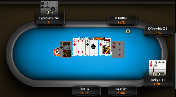 Με 2.5 blinds o "CopperCoin" βρέθηκε all in κρατώντας Α-Q με τον "KI4ARATA77" που έκανε το call να ανοίγει J-J. To board έδωσε το full house στον τελευταίο και έτσι ο "Coppercoin" αποχώρησε κερδίζοντας $104.