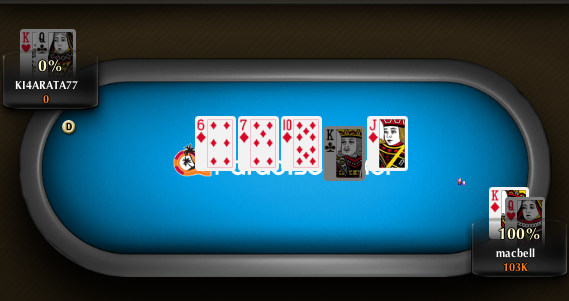 Ο "KI4ARATA77" έκανε raise και ο "macbell" ακολούθησε με call. Το flop άνοιξε 67T και οι παίκτες το πέρασαν με check. To turn άνοιξε K και ο "KI4ARATA77" πόνταρε από το button για να δει τον αντίπαλο του να μπαίνει all in. Άμεσο το call από τον "KI4ARATA77". Και οι δύο παίκτες κρατούσε K-Q, όμως ο "macbell" είχε το K. To river άνοιξε J και έτσι όλα τελείωσαν στον τρίτο τελικό του X-Mas Cracker.